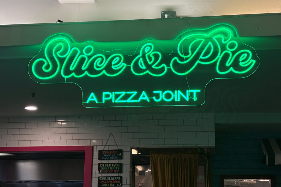 Slice & Pie showcases the personality of flamboyant Italian-born pizza impresario, Giulio Adriani. The Slice & Pie logo even features a drawing of Adriani wearing his trademark John Lennon specs. Giulio’s pics are plastered all… Slice & Pie