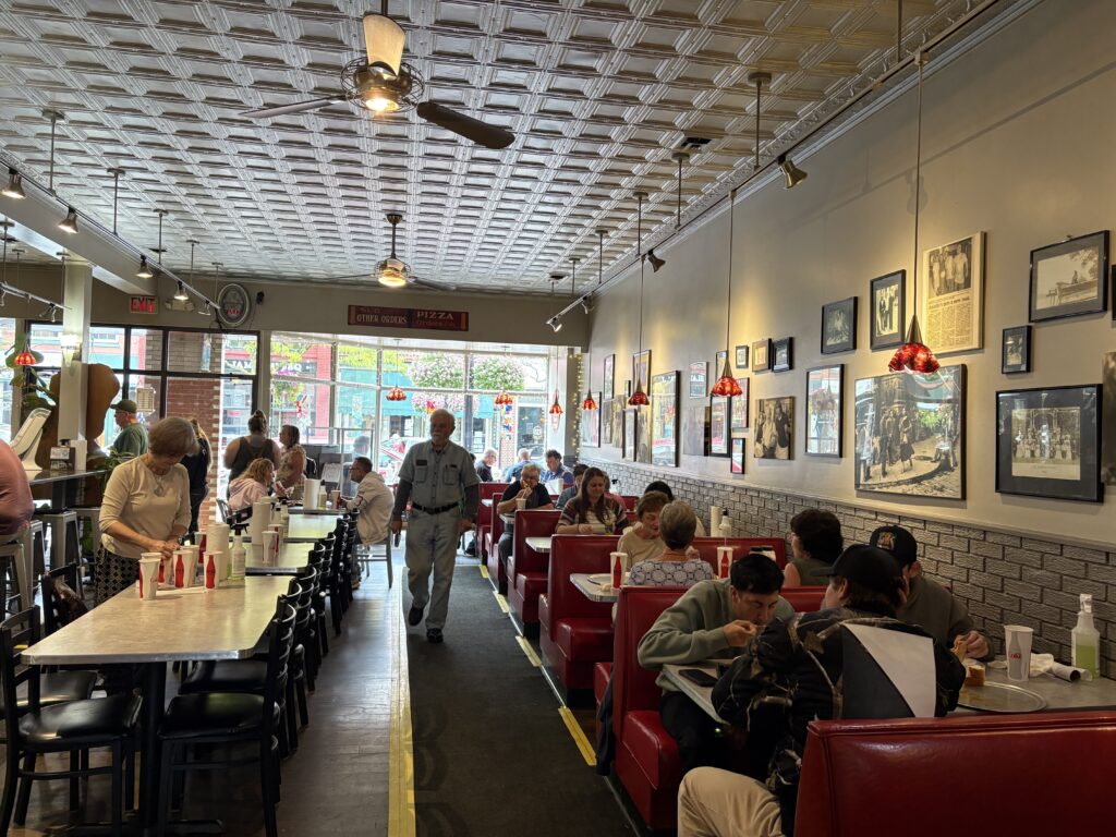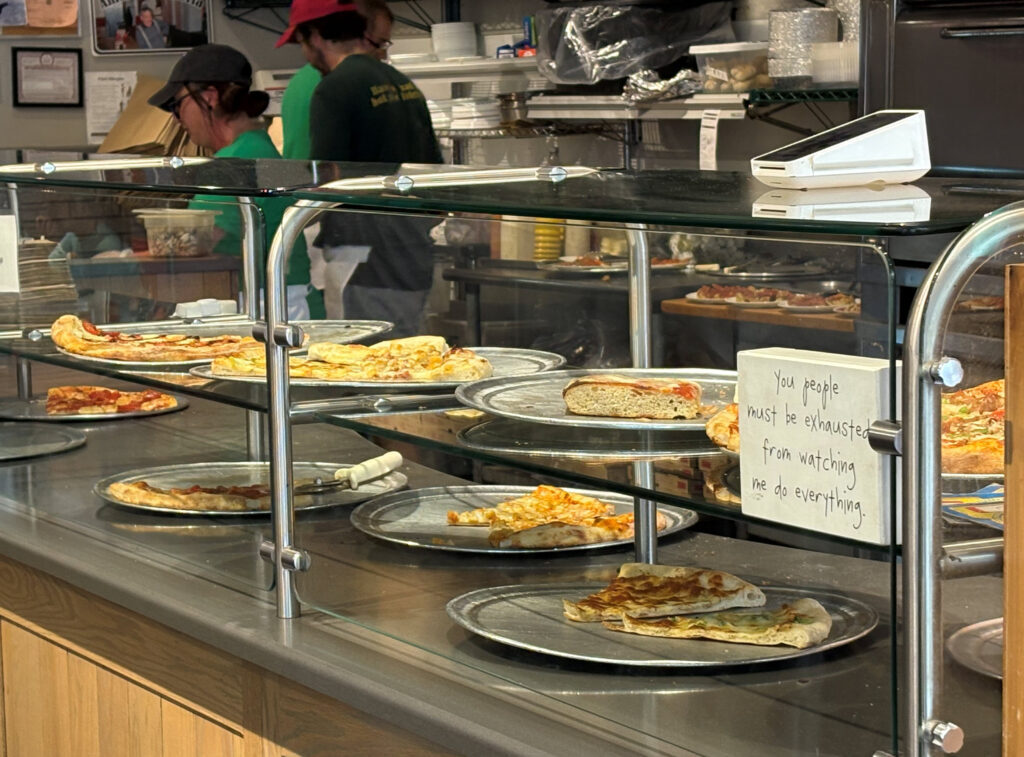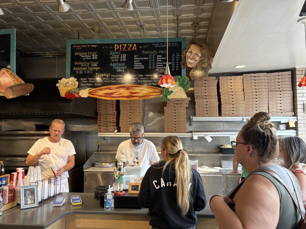 Many out-of-towners who visit Aniello’s probably make it to the glass museum. However, most of the glass museum patrons are probably too hoity toity to even consider Aniello’s as a lunch spot. Yet, in this precious, beautiful town, the unpretentious Aniello’s, a family-run fixture since 1972, slings slices for $2.30 – a bargain anywhere.