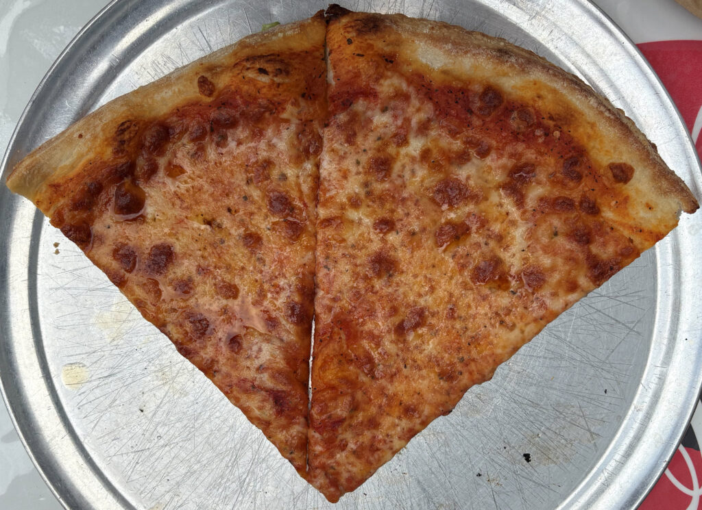 Sadly, in a State renowned for its pizza, Aniello’s doesn’t approach the top tier. At least Aniello’s serves New York-style pizza, but its execution is flawed. The crust is nice – chewy and firm as one expects from a steel deck oven. The sauce is a secret family recipe, fresh with hints of onion, garlic, and oregano. It’s a nice touch that they serve slices on pizza pans. But the mozzarella is so greasy that blotting requires several of the restaurant’s non-absorbent napkins, and it leaves an orange mess.1 Unfortunately, regardless of one’s preference for oil removal, the cheese is also too salty.