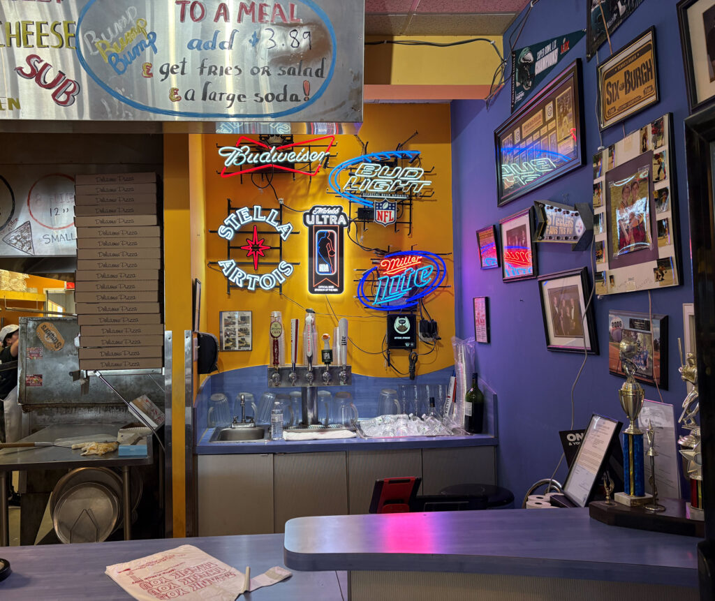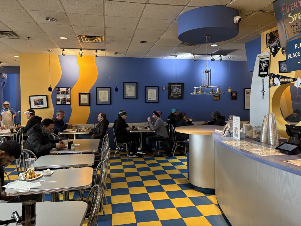 Nature meets Industrial epitomizes today’s restaurant design aesthetic. This style encompasses warm, earthy tones, exposed wood and stone, lush greenery, and dimmable, intimate lighting. It’s unclear why the Feldmans chose a yellow and blue motif for their restaurant, but it’s the antithesis of current design. Fashionable diners may sneer at Guiseppi’s datedness. However, DishingPizza and Ukrainian nationals prefer the Guiseppi’s vibe over anything else in the area.